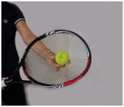 2)二番目の動作: 左右の足を、少し開いて、ラケットとボールを体の前で軽く接触させ、サーブを開始する準備ができた状態(”Ready”という語で代表させる)。大切なことは、重心が幾分左足に置かれ、肩のみならず全身の力がほどよく抜け、心もリラックスしていることである。図2を参照されたい。