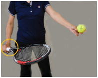3)三番目の動作: 重心を右足に移しながら、ボールをもった左手はほとんど動かさないで、ラケットを体に近づけつつ右下に動 かす動作(”One”という語で代表させる)。ラケットが止まる直前にグリップを強く握りしめ、直ちに力を抜く。初心者は、ラケット のヘッドを大きく下に移動させずに、手首を返してラケットの面を水平に近づけるといい。ここでつくった面は、そのまま頭上で打球する際の面になるからである。図3のオレンジ色の円内を参照されたい。左手はほとんど動かさないで、右手のみを動かし、力を入れて抜く。これらを繰り返し練習することで、左右の手を、別々にコントロールできるようになる。すなわち、正確なサーブを実施する上で必須のリズムが獲得されるのである。