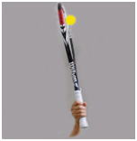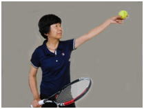 4)四番目の動作: 左手でトスを開始する動作(”Two”という語で代表させる)。図4を参照されたい。ここで大切なのは、左 手のトスの動きに引きずられて、右手のラケットを同時に動かさないことである。トスとラケットを同時に動かすと、ラケットの動 きに引きずられて、トスが後方に流れて打点が後方になってしまい、強くて正確なサーブを打つことが困難になる。トスの開始から少し遅れて、ラケットの振り上げを開始することが大切である。トスが適切な位置にあがったかどうかの判断は、落下してき たボールが、手から放れた位置で受け取れれば、成功である。